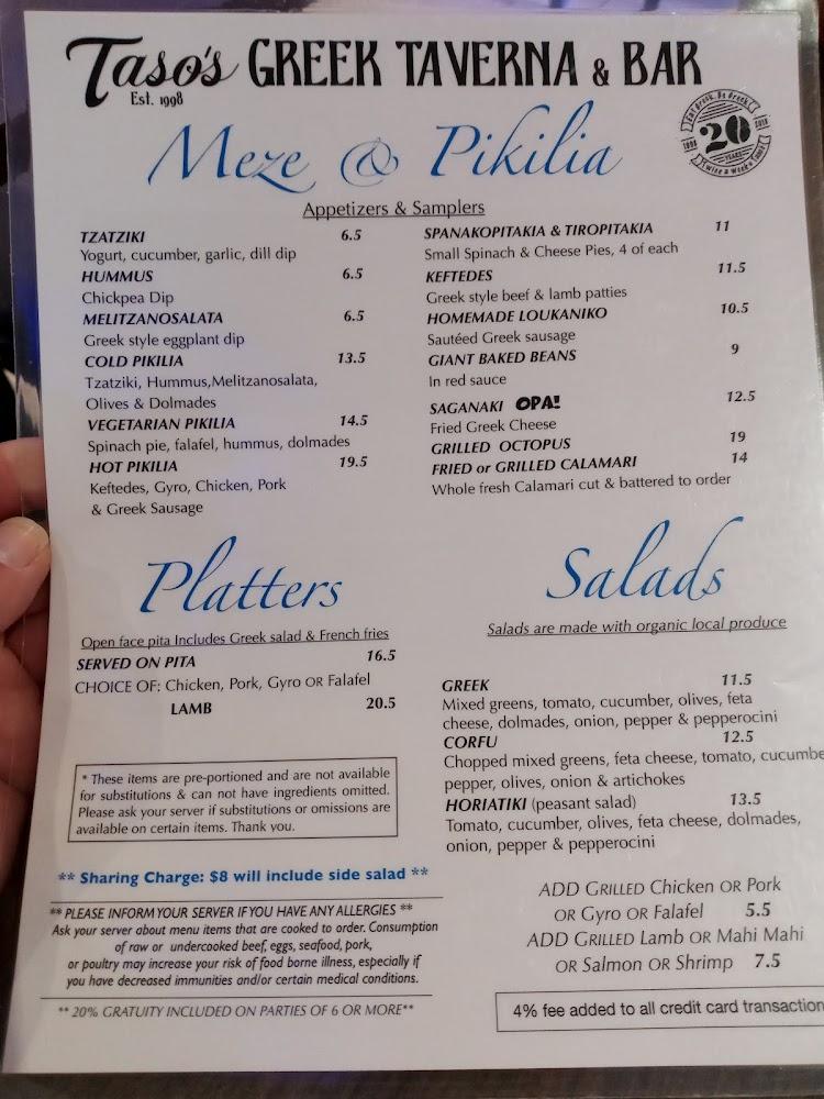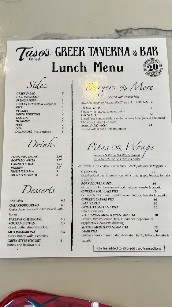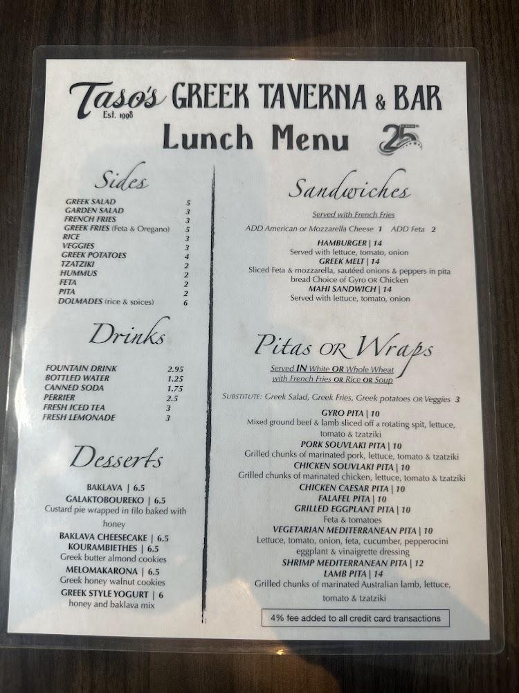 Taso's menu features an impressive array of Greek dishes. Diners can explore various appetizers like homemade hummus and spanakopitakia. Salads such as the classic Greek and Caesar complement the meal perfectly. The platters offer a taste of multiple favorites, including chicken, lamb, and falafel. For seafood lovers, dishes like red snapper and shrimp kabobs shine. Don't miss the desserts, especially the baklava and choc baklava cheesecake. Each dish comes at a reasonable price, ensuring good value for the quality offered. The menu caters to different tastes, making it suitable for families, individuals, and groups. Taso’s serves something for everyone, bringing the flavors of Greece right to Delray Beach.